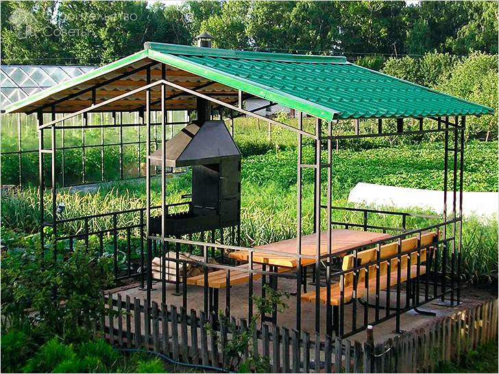 Лучше сделать беседку из металлопрофиля, это будет несложно.Толщина профиля не менее 2 мм.