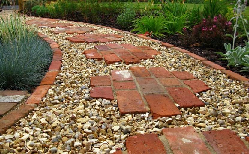 Декор гравийной дорожки красным кирпичомИсточник seattlehelpers.org
