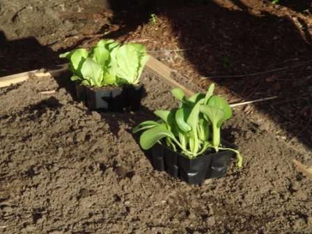 Высадка рассады. Лунки на грядке, для кочанных сортов, делают по схеме 50 х 30-40 см., для листовых сортов 30 х 25-30 см. В каждую лунку добавить 1/2 стакана золы и 1 ч. л. комплексного удобрения, перемешать с землей, пролить теплой водой и высадить саженец. Пекинскую капусту можно высаживать более часто, с последующим прореживанием для использования в пищу.