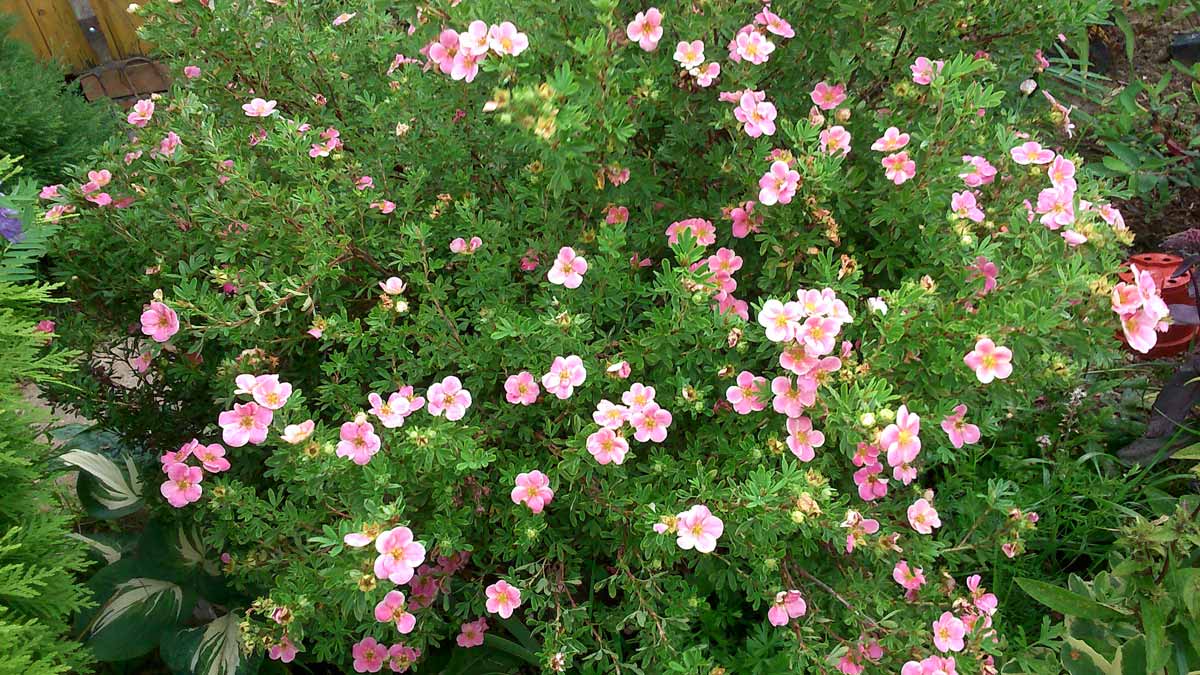 Лапчатка кустарниковая «Пинк Квин» (‘Pink Queen’) – куст высотой 80 см. Цветение лапчатки «Пинк Квин» начинается с июня и по сентябрь.