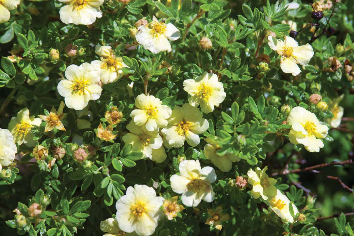 Лапчатка кустарниковая “Примрозе Бьюти” (‘Primrose Beauty’) – шарообразный куст, диаметр кроны и высота 1,2 м. Цветки лапчатки “Примрозе Бьюти” мелкие, светло-желтые, многочисленные.