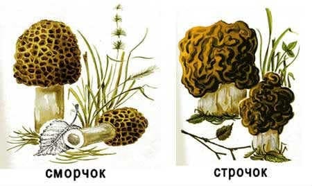 Многие начинающие охотники, увидев шляпку обоих семейств, перестают задаваться вопросом, как она выглядит. У сморчков — она более вытянутая, напоминающая форму конуса. Имеет дырочки, визуально сравнимые с высохшей, сморщенной губкой. Шляпки строчков — более необычные, сравнимые с восточными головными уборами, имеющими округлые, слегка растянутые очертания. В сравнение с ножкой, шляпка имеет главенствующий размер.